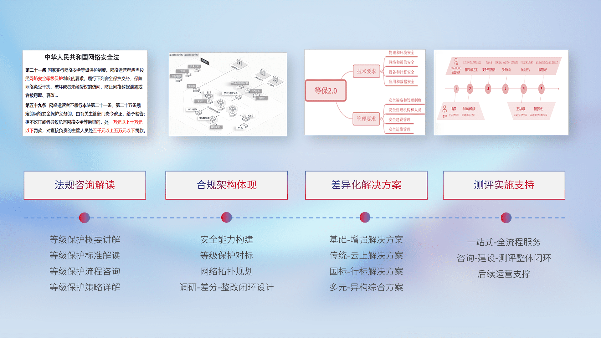 通过专业的法律咨询解读、、、合规架构体现、、、差异化解决方案、、、测试实施支持等服务,,为客户量身打造等保合规体系。。